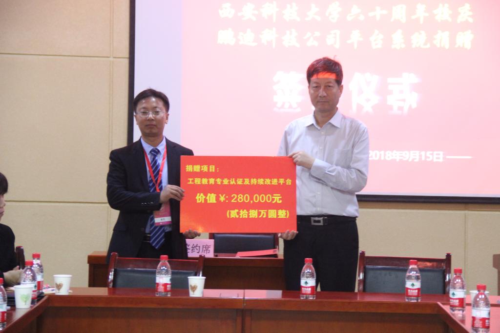 西安鹏迪信息科技有限公司无偿向母校捐赠自主研发的价值28万元的工程教育专业认证及持续改进大数据平台。双方共同签订了捐赠协议,之后双方将在产学研领域展开全面合作。