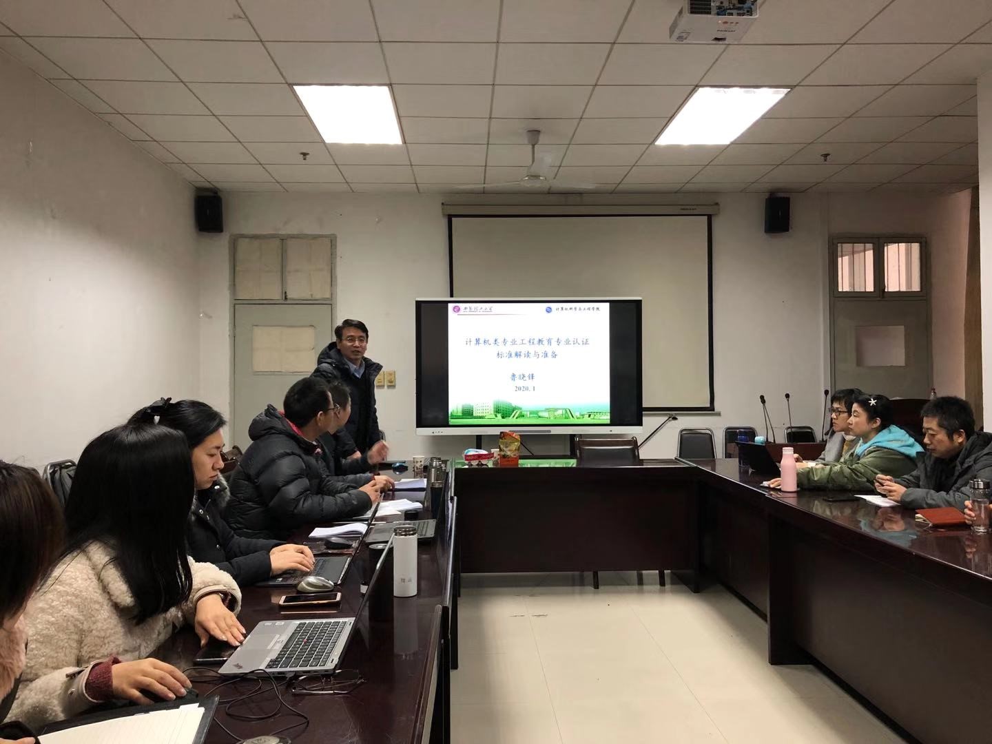 首先,鲁晓锋副院长做了题为《计算机类专业工程教育专业认证标准解读与准备》的报告,解读了工程教育认证的国内外背景,自评报告七个部分的内涵要求和注意问题,以及专家进校各环节的细节问题。 然后,王树奇副院长从明确OBE机制、数据和能力关系,以及立德树人等三个方面进行了解读。报告后,工作组老师针对撰写过程中遇到的课程达成评价、毕业要求分解等具体问题,跟鲁院长和王院长进行了深入的讨论。