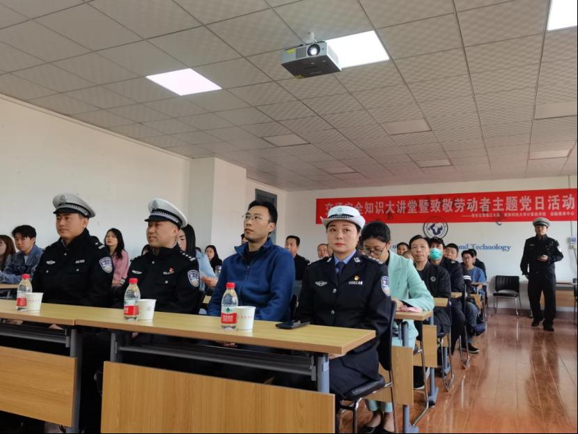 429日上午,计算机学院与后勤处联合举办的交通安全知识大讲堂暨致敬劳动者主题党日活动,在临潼骊山校园在计算机学院512学术报告厅举行。西安交警曲江大队副队长谢勇涛、曲江大队西影路中队副队长崔浩哲、民警何莺歌、王斌,西安科技大学后勤处副处长孙涛、后勤处运输服务中心、计算机学院师生党员和入党积极分子代表60余人参加此次活动。