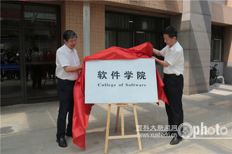 副校长邓军宣读关于软件学院成立的通知,副校长张威虎、计算机学院负责人共同揭牌。