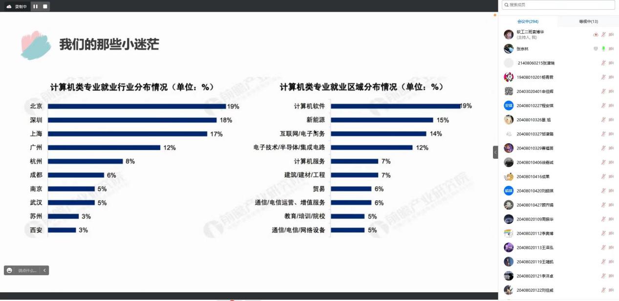 张宗林结合自身在校期间学习计算机专业知识的经历,回应了学生关注的“迷茫”问题,结合职业经历对计算机行业现状、毕业生就业考研方向选择、招聘中的职场技巧等方面进行讲解,勉励同学们认清形势、耐住寂寞、坚持不懈、苦修内功,做到以梦想为光,行稳致远。