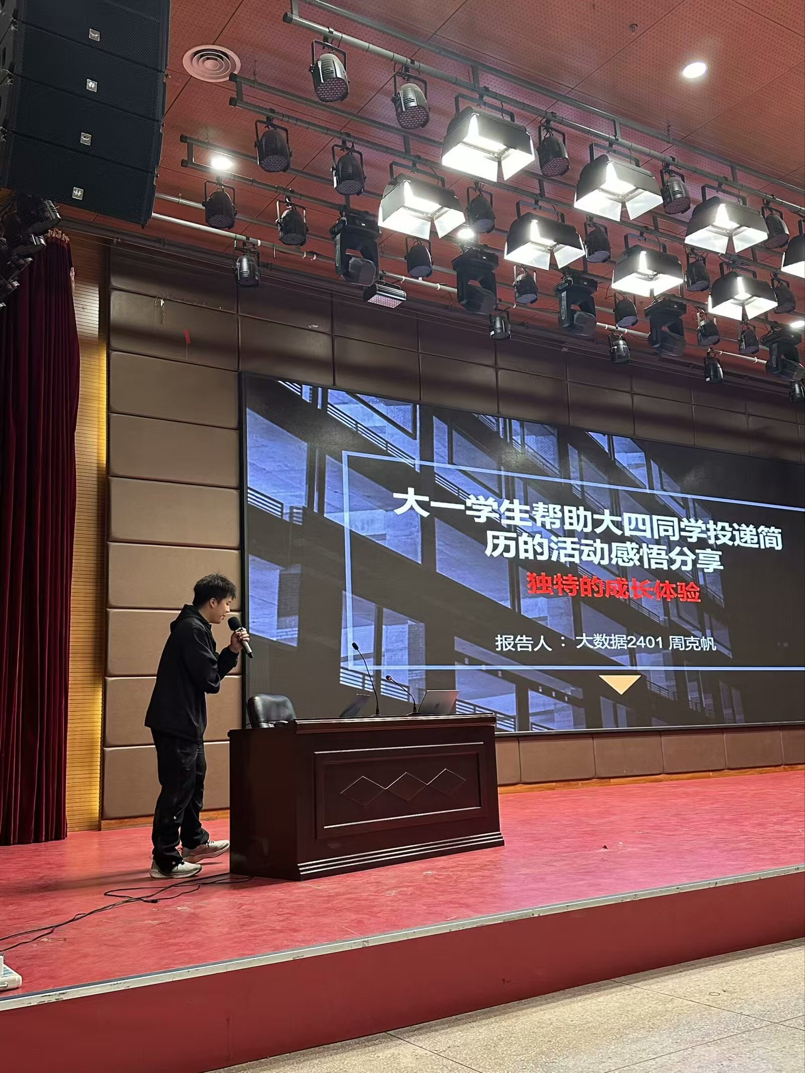 大数据专业大一新生周克帆激情满满的讲述了近期举办的“职启未来、投递梦想2V1互助活动”,即:大一协助大四学长投递简历活动。他作为一名参与者谈了整个历程和自我感悟,深刻认识到提前规划的重要性,也更加明确了自己大学四年的努力方向和内容。