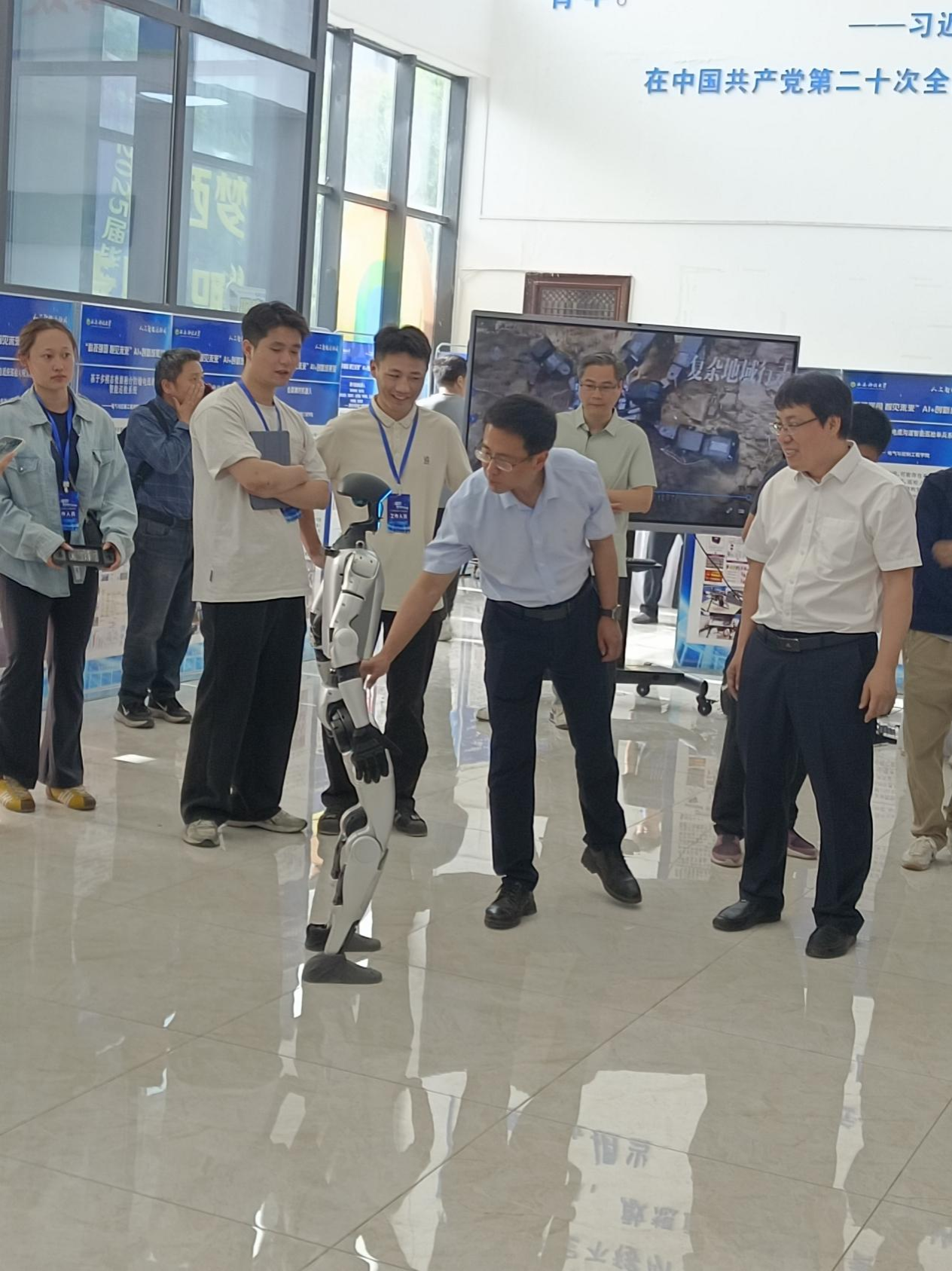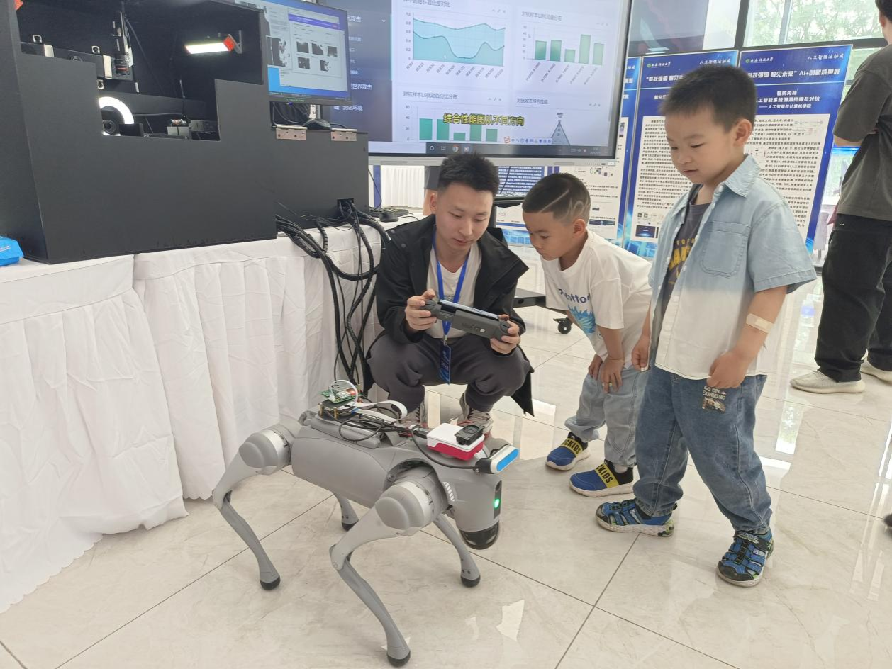 曾亮相体育节和工作会议的“网红”机器狗,此次展示了坐、卧、行走等指令。配备热像仪、激光雷达等传感器,可应用于高危环境智能巡检。侯锐志老师表示:“已实现从感知到认知的跃迁,为安全巡检提供创新解决方案。”