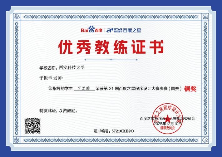 决赛当天,李姜帅同学沉着冷静、从容应战,面对复杂的竞赛题目,迅速理清解题思路,高效完成程序编写与调试。凭借清晰的逻辑架构、规范的代码实现与合理的时间分配,最终成功跻身铜奖行列,实现了西安科技大学在百度之星程序设计大赛中的历史性突破,也是学校“以赛促学、以赛促练” 人才培养模式的生动实践。