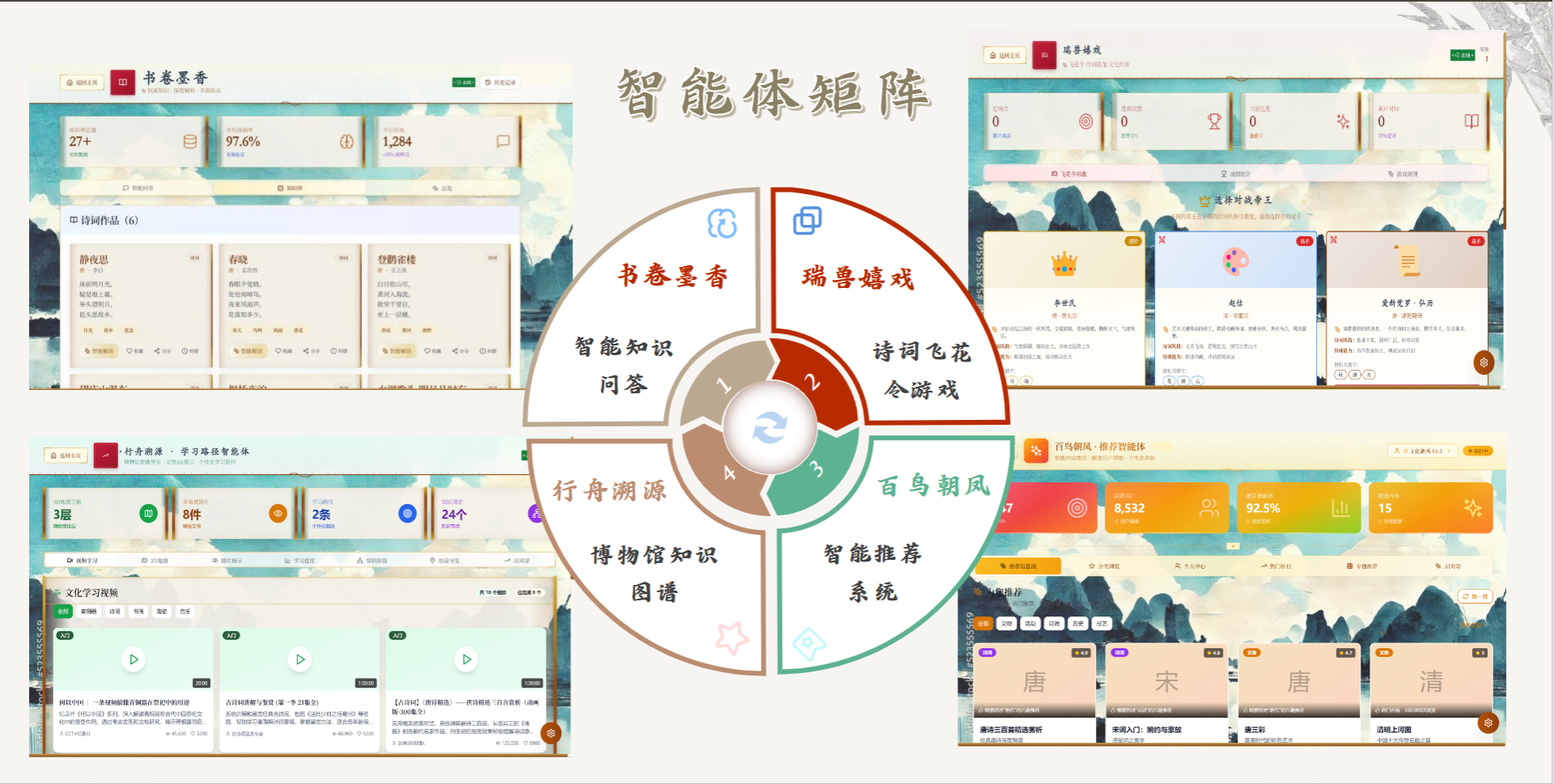 “国韵智语”以“微信小程序+AI智能体矩阵”为核心载体,构建了“学-玩-藏”一体化传统文化学习平台。不同于传统诗词类产品的单一功能模式,该项目打造了四位一体的核心竞争力:以NLP模型与RAG检索技术筑牢技术壁垒,百万级知识库夯实内容根基,游戏化与社交化设计深度锁定用户心智,更依托微信生态打通全域流量入口,而贯穿其中的多智能体协作系统,成为项目的“神经中枢”。