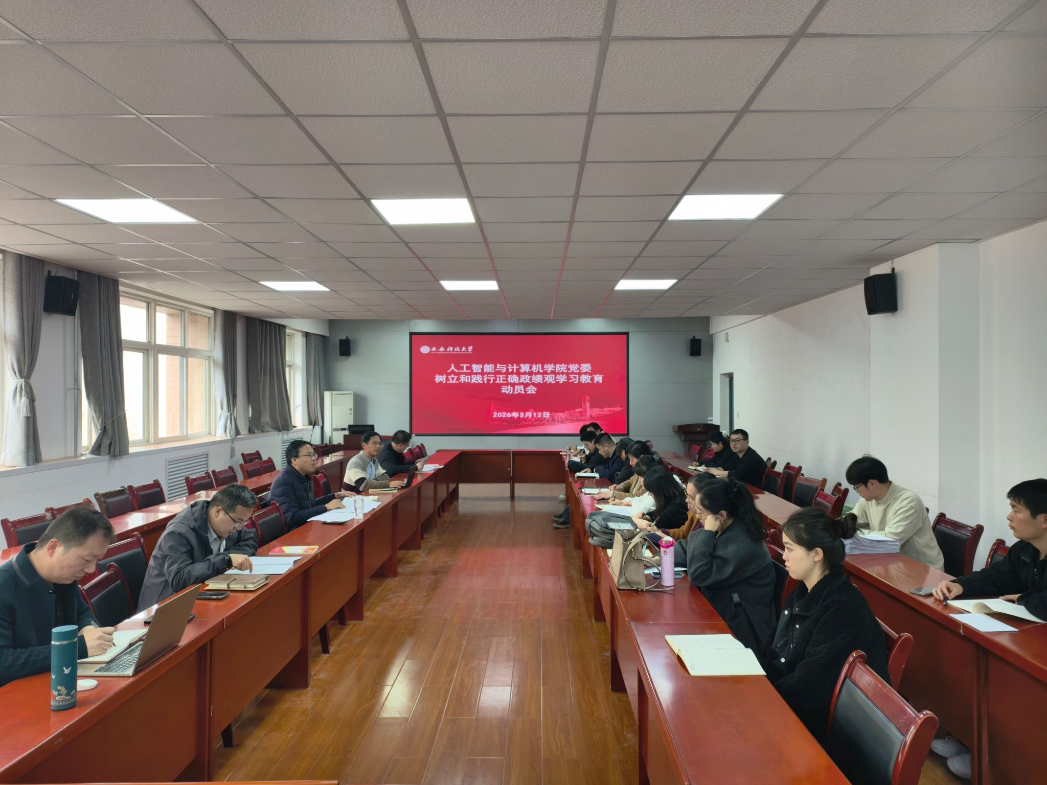 3月12日下午,人工智能学院党委在临潼校区骊山校园召开树立和践行正确政绩观学习教育动员会。学院党政领导班子成员、各党支部书记、全体辅导员参加会议。