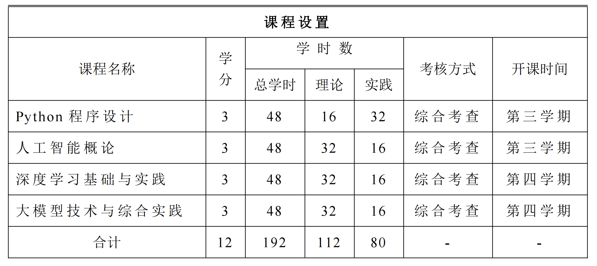 大模型技术与应用微专业以“技术引领、应用驱动”为核心理念,打造多元教育教学模式,构建个性人才工程实践教学体系,培养具有跨界思维、创新意识和自主学习能力的复合型人才,为学生多元发展与个性需求提供广阔空间。计划开设4门课程,包括Python程序设计、人工智能概论、深度学习基础与实践和大模型技术与综合实践,每门课分理论和实践两个环节。