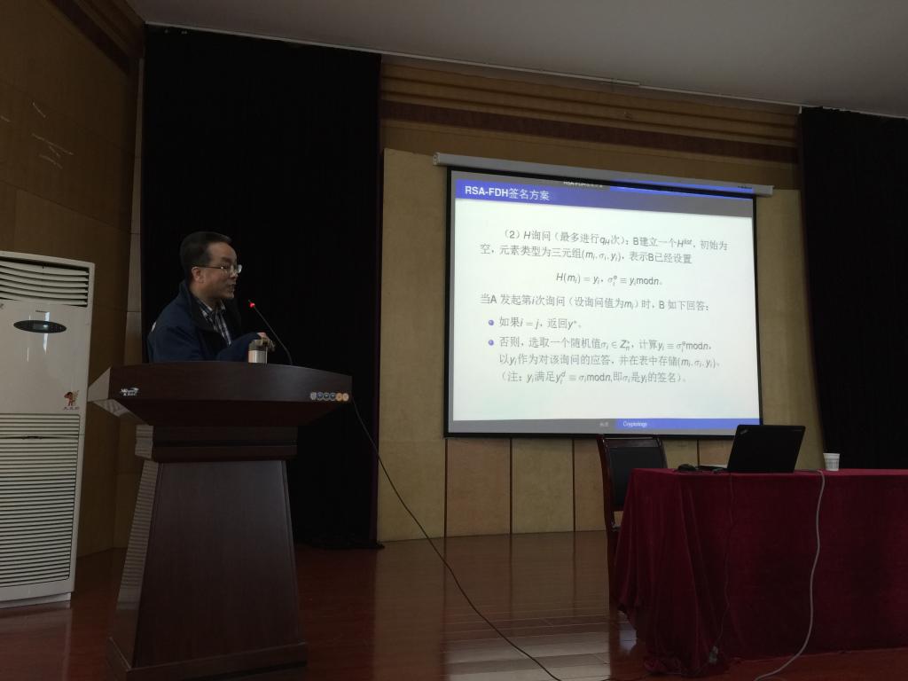杨波教授对该领域的相关概念进行了介绍。首先,介绍了可证明安全性的发展、定义和使用的数学工具,该领域的研究工作起源于Shannon的完善保密理论,但该理论依赖于无限的计算能力,使其缺乏实际指导意义。近年来,通过引入计算复杂性、概率算法和随机预言模型,使得可证明安全的研究逐步走向实用。随后,杨波教授以基于身份的加密方案为例,介绍其使用方法,使得学生能够严格的分析和证明现代密码学方案的信息防护能力。同学们纷纷表示通过此次报告会收获了很多知识,开拓了眼界,增强了自己的学习热情和信心。