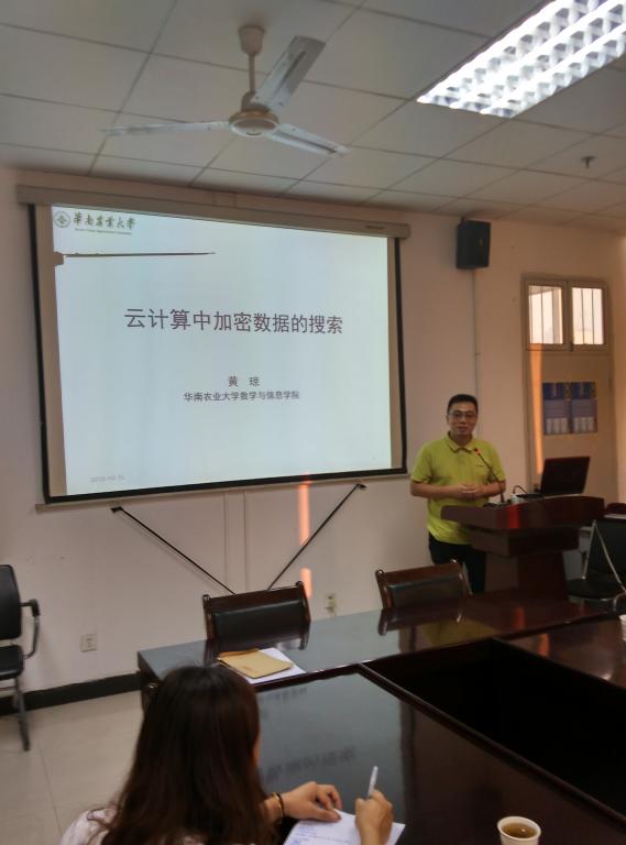 10月15日下午5:00,华南农业大学数学与信息学院、软件学院副院长,硕士生导师黄琼教授在星空体育中国官方网站410会议室做了题为《云计算中加密数据的搜索》的学术讲座。星空体育中国官方网站全体研究生同学和部分老师参加了本次讲座。