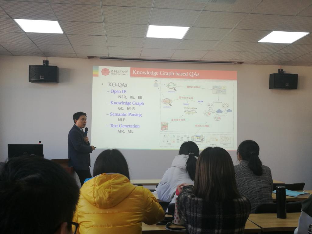 首先,马院长简单介绍了宋教授的研究方向,以及科研成果。接着,宋教授就向大家讲述了基于知识图谱的智能问答技术。报告以自然语言处理、知识图谱和机器学习为基础,详细介绍知识图谱构建、知识融合、存储和查询转换等关键技术及其典型应用,深入探讨基于知识图谱的智能问答关键技术体系及应用前景,由浅入深,由表及里层层递进。之后,宋教授也向大家展示了有关的科研成果,即智能问答的应用场景。最后宋教授向大家传授了关于科研创新的一些技巧,并提醒同学们要自主创新,自主发现问题并努力去寻求解决方案。