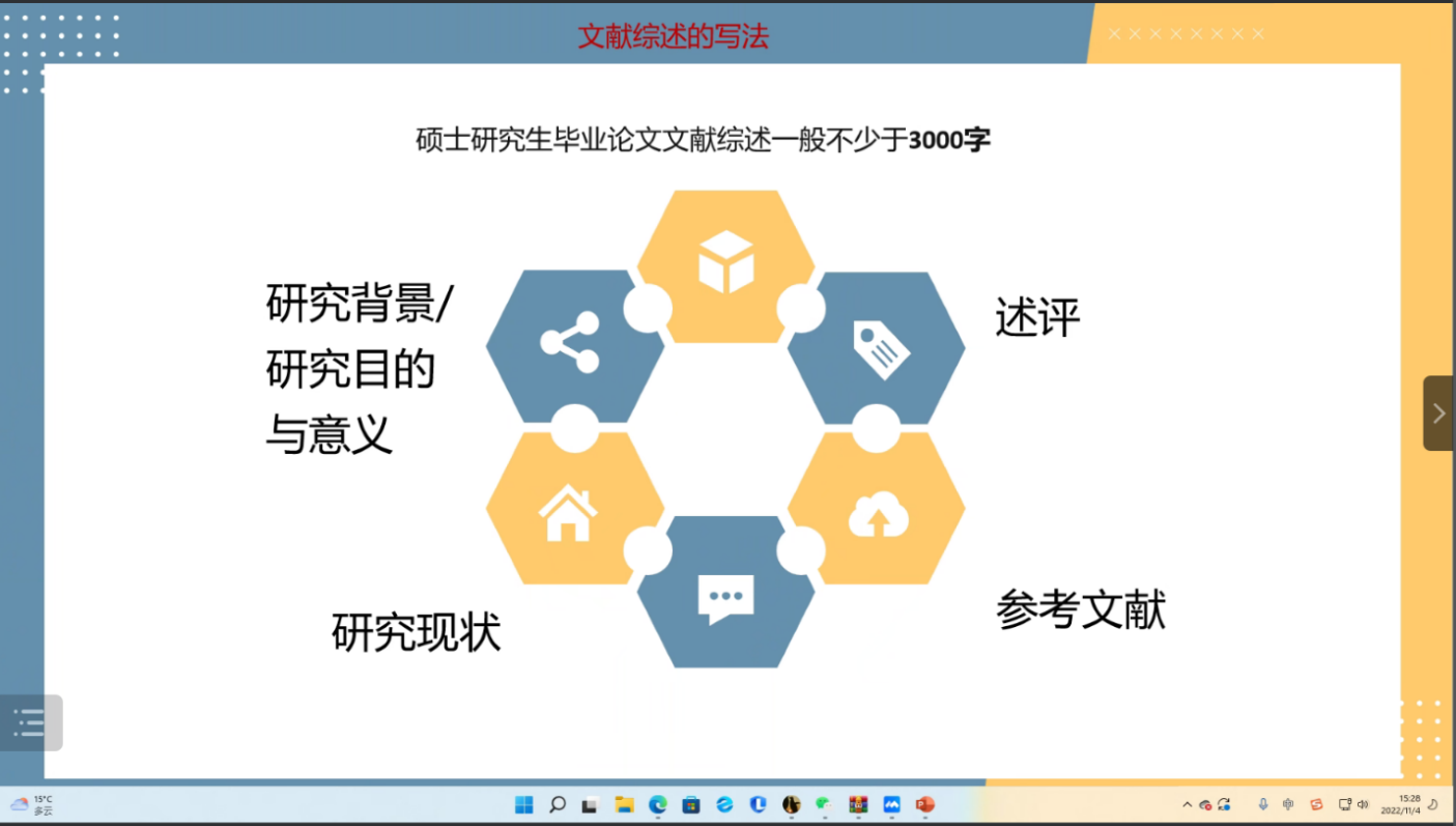 王晓文老师主要从文献综述的概念、代表性文献的阅读、文献综述的写法、常见问题分析四方面介绍文献综述的撰写。