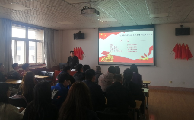 为迎接建党100周年,进一步激发党组织活力,增强广大党员的光荣感、使命感。2021年3月25日下午,2020级学生党支部组织全体党员进行“学党史、守初心、担使命“主题党课的学习,本次党课由支部书记宋永强主持,学院党委副书记陈伟伯、支部全体党员同志以及入党积极分子参加本次党课。