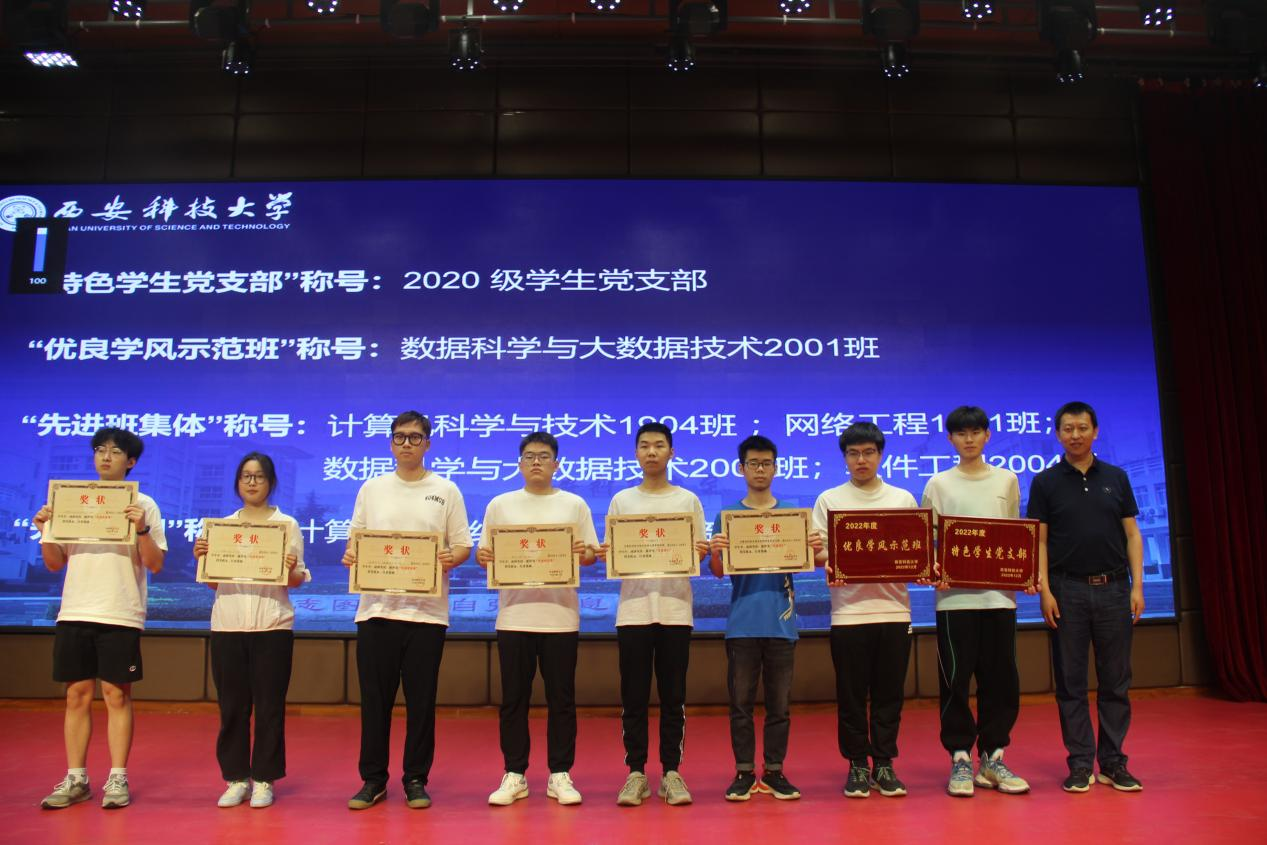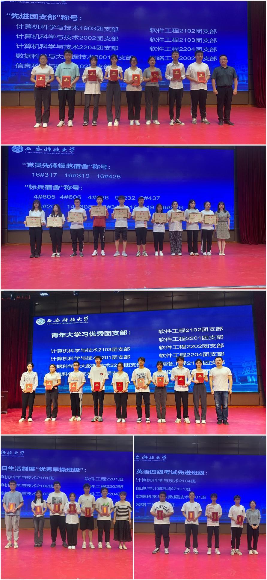 会上,金浩宣读了《关于表彰2021—2022学年学生先进集体、优秀个人的通报》《计算机学院关于2022年“青年大学习”网上主题团课学习情况评优结果的通报》《计算机学院关于表彰2021级英语四级考试先进班级的通报》《计算机学院关于表彰“一日生活制度”先进班级的通报》等表彰文件。并为获得“先进团支部”荣誉称号的计算机科学与技术1903团支部等9个团支部颁发了荣誉证书,学工办负责人为获得“党员先锋模范宿舍”“标兵宿舍”称号的宿舍颁发了奖状,辅导员老师们分别为获得“青年大学习优秀团支部”“英语四级考试先进班级”、一日生活制度“优秀早操班级”“优秀晚自习班级”等集体颁发了荣誉证书。