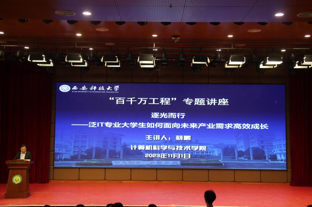 11月1日,计算机学院在骊山校园煤炭科技一楼报告厅举行“百千万工程”讲座暨立人大讲堂第十七讲,西安软件园人才服务负责人,西安市招才引智“校园引才特使”蔡鹏作了“逐光而行——泛IT专业大学生如何面向未来产业需求高效成长”的主题讲座。计算机学院党委副书记郭胜忠主持讲座,辅导员王兰、张珍珍、鞠纪元,学生代表400余人参与聆听。