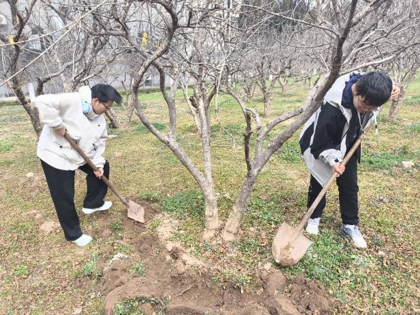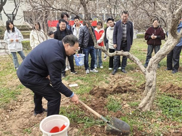 后勤处临潼物业管理服务中心绿化主管张晓妮现场讲解并演示了石榴树施肥、培土的注意事项。随后,参加活动的师生们纷纷拿起工具,参与到为石榴树施肥培土的劳动中。师生们分工有序,挥锹培土、播撒肥料、悬挂名牌,现场洋溢着团结协作、昂然向上的氛围。